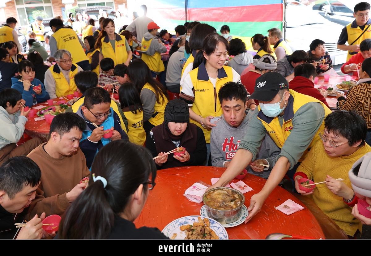 本日エバーリッチは、大園区の社会的弱者家庭への支援、生活物資の寄贈、祝福の言葉を届けるなどの公益活動を実践するため、約40名のボランティアを桃園市の各地に派遣しました。また、エバーリッチは2008年より「真善美社会福祉基金会」への支援を継続しており、同機構は18歳から75歳までの知的障害者に専門的な支援とサービスを提供しています。ボランティアは、お花見、陶芸、端午節の香包作りなどの多様な交流活動を通して、利用者の心身の成長を見守ってきました。この日、「江おじさん」こと江松樺董事長は利用者とともに歌や踊りを楽しんだほか、一足早い春節の団らんを共にし、会場は温かな雰囲気に包まれました。