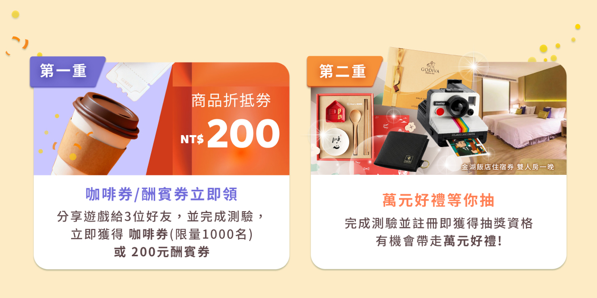 只要分享遊戲結果,並邀請 3 位好友完成測驗,直接送你「超商咖啡☕」或「200元酬賓券」!