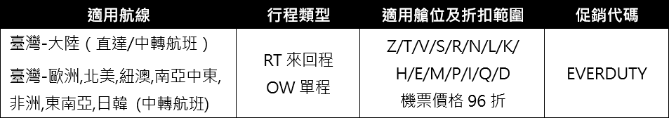 即日起至2025/12/31止,於東方航空官網使用折扣碼 EVERDUTY 購買指定航程,即享96折購票優惠!※使用折扣碼需先註冊東方萬里行會員