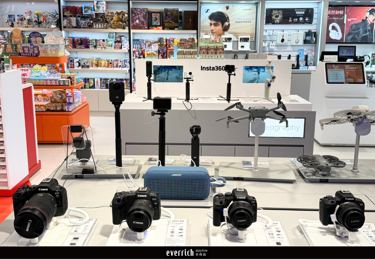 門市集結人氣潮流玩具、盲盒商品與療癒系公仔,讓大人小孩都能在登機前找到屬於自己的驚喜收藏;同時設有 Insta360 體驗櫃位與 Canon 相機展示區,提供實機操作與拍攝體驗,無論是旅遊紀錄、運動拍攝或影像創作需求,都能在出發前一次到位。