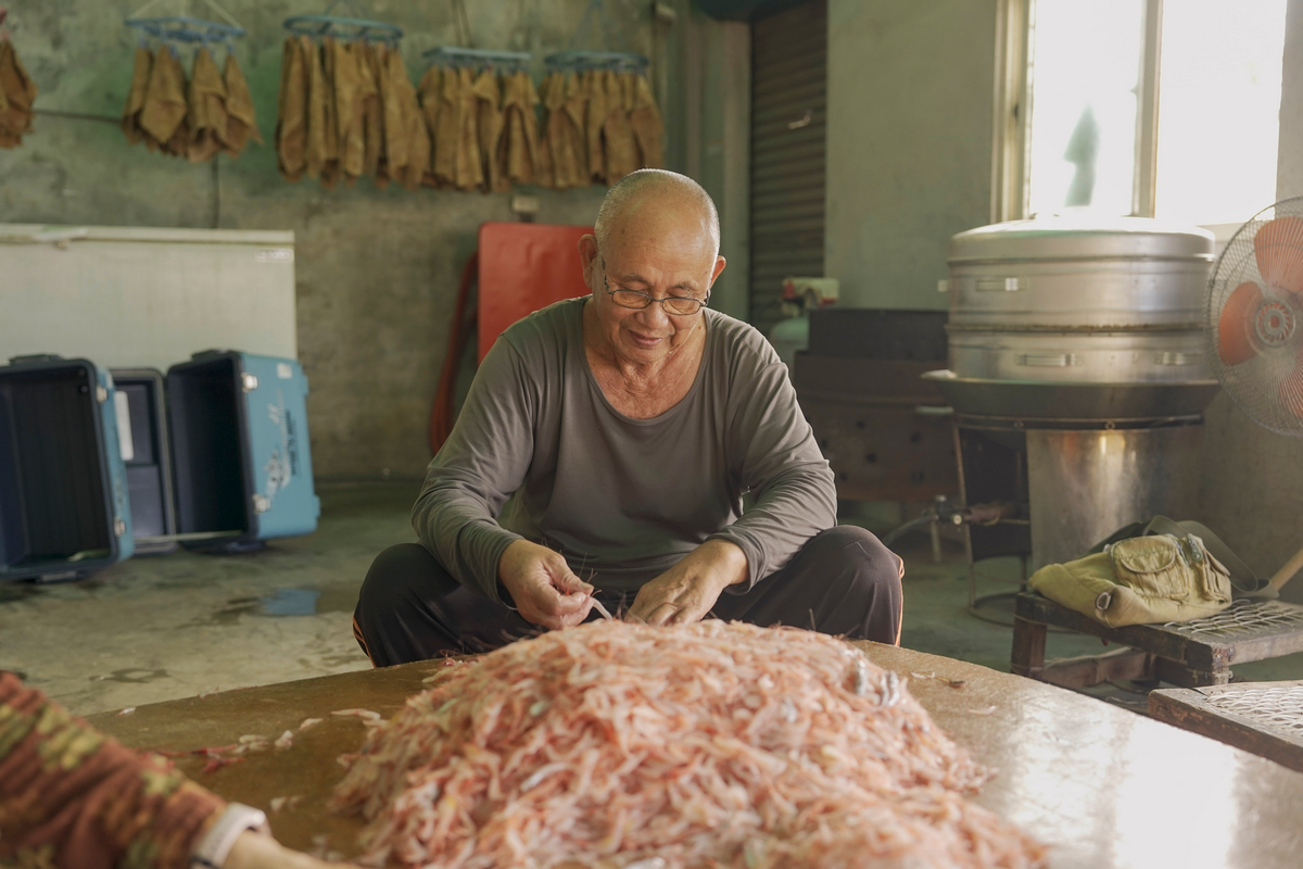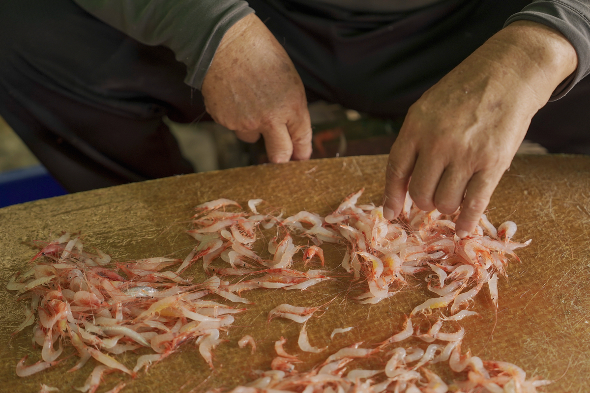 櫻花蝦的捕撈期在冬天到春天,每到那段時間,凌晨出海、隔天返航,是家常便飯。寒風中,他與船員一邊作業、一邊觀察海況;捕撈到的櫻花蝦在船艙裡閃著柔粉色的光,溫柔而喜悅。