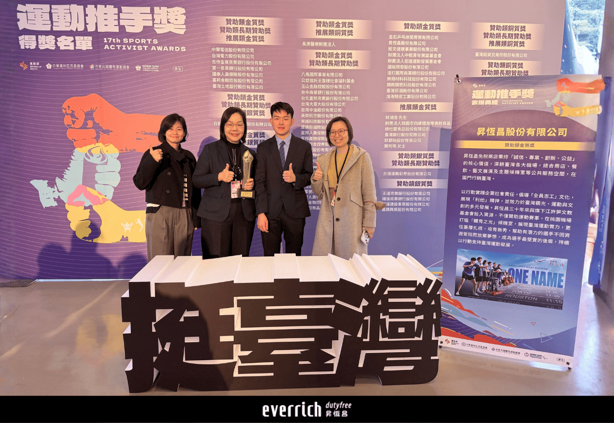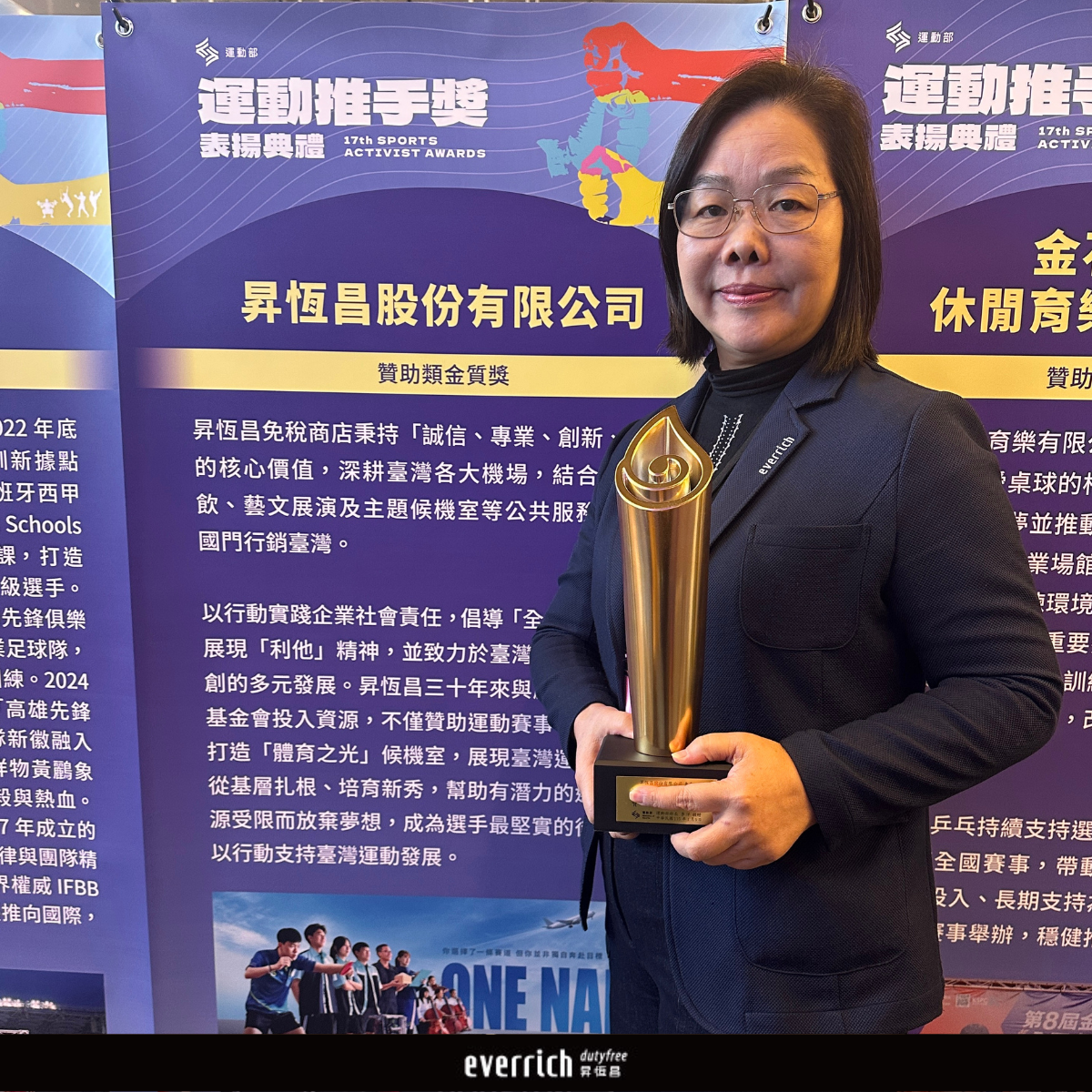 Standing at the nation’s gateway, EVERRICH Duty Free Shop not only safeguards every traveler’s journey but also quietly supports Taiwan’s sporting dreams beyond the arena. Due to its long term investment in sports development and support for grassroots athletes and emerging talents, EVERRICH was honored with the Ministry of Sports 2025 Sports Activist Awards - Golden Quality Award. The award was presented by Minister Yang Lee in person at the 17th Sports Activist Awards ceremony, affirming EVERRICH’s steadfast commitment to nurturing young athletes and supporting the foundations of Taiwan’s sports ecosystem.
