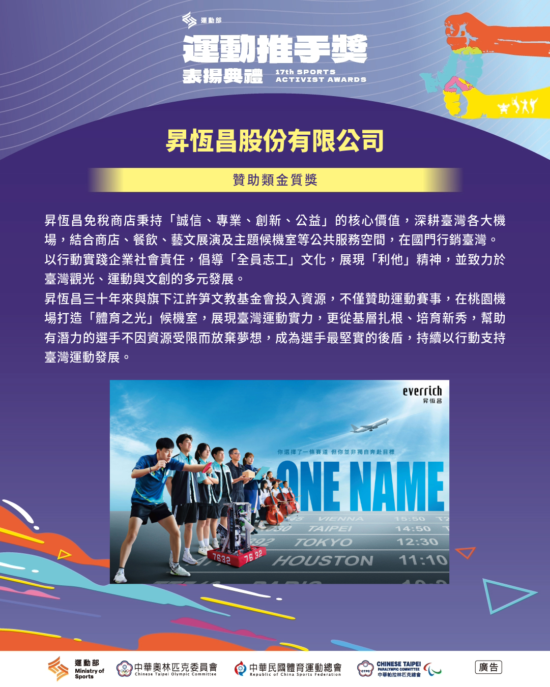 The recognition of the 2025 Sports Activist Awards represents the outstanding results of EVERRICH’s long standing dedication to sports development and the fulfillment of its social responsibility. Looking ahead, EVERRICH will continue to uphold its altruistic values, supporting the growth of Taiwanese sports through meaningful action, accompanying more athletes onto the international stage, and remaining the warm, supportive presence behind them as they pursue their dreams.