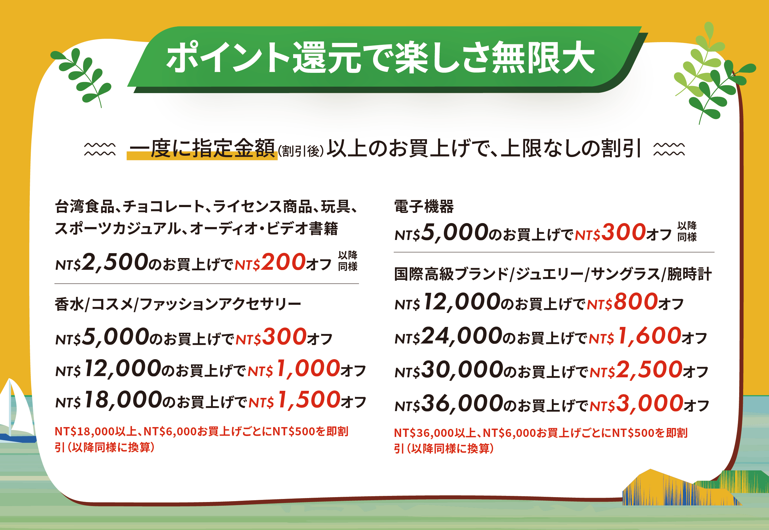 NT$36,000以上、NT$6,000お買上げごとにNT$500を即割引(以降同様に換算)