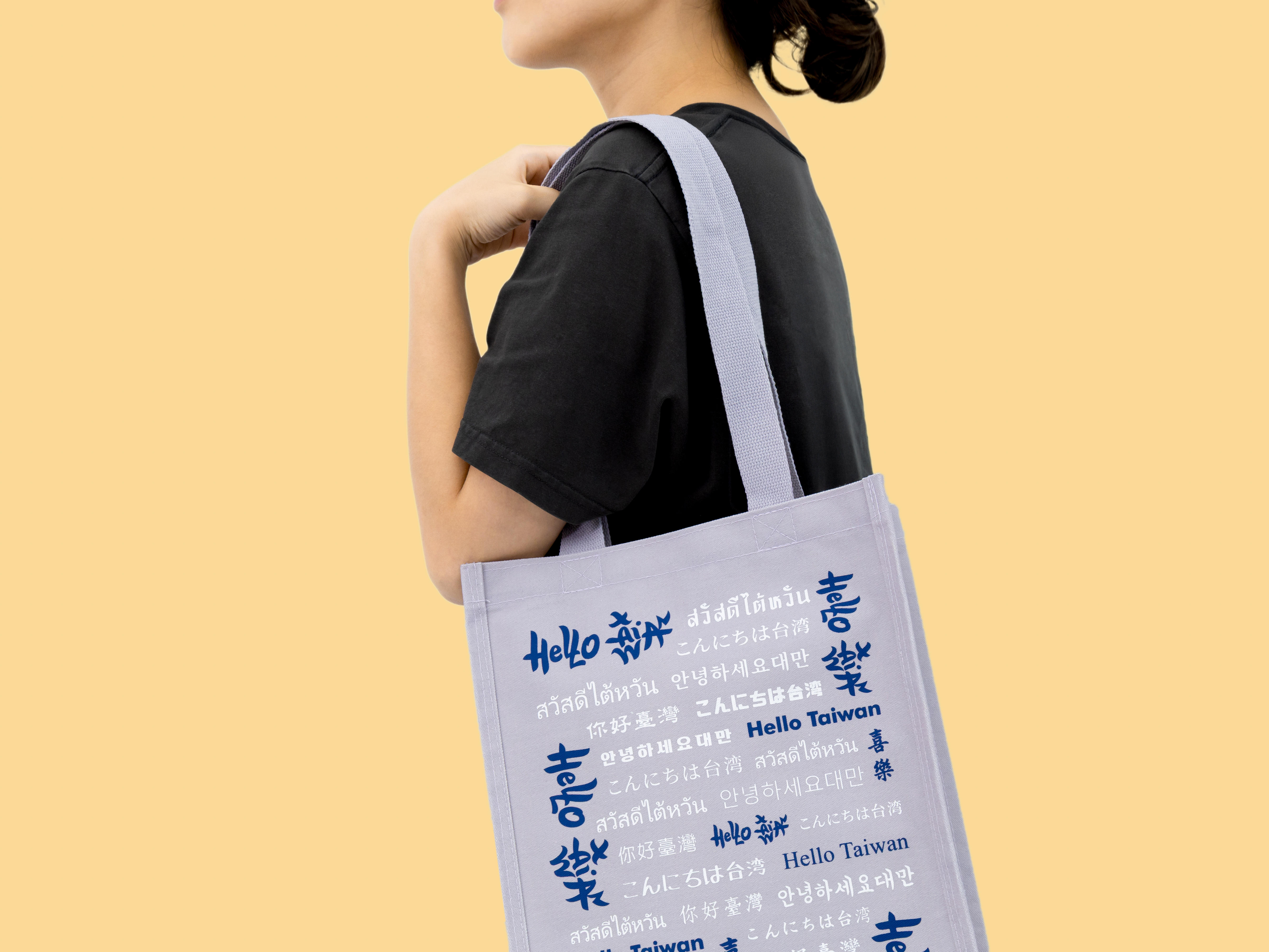 The main visual centers around a playful flip of the words “Hello Taiwan” and the Chinese characters for “joy,” incorporating greetings in multiple languages—including English, Chinese, Japanese, Korean, and Thai. The design is clean yet clever, capturing the warmth and hospitality that Taiwan is known for. The bag features a soft, elegant lavender tone, making it perfect for everyday use or as a travel keepsake. It can be a stylish cultural accessory for your journey, or a heartfelt gift infused with local culture for your family and friends.