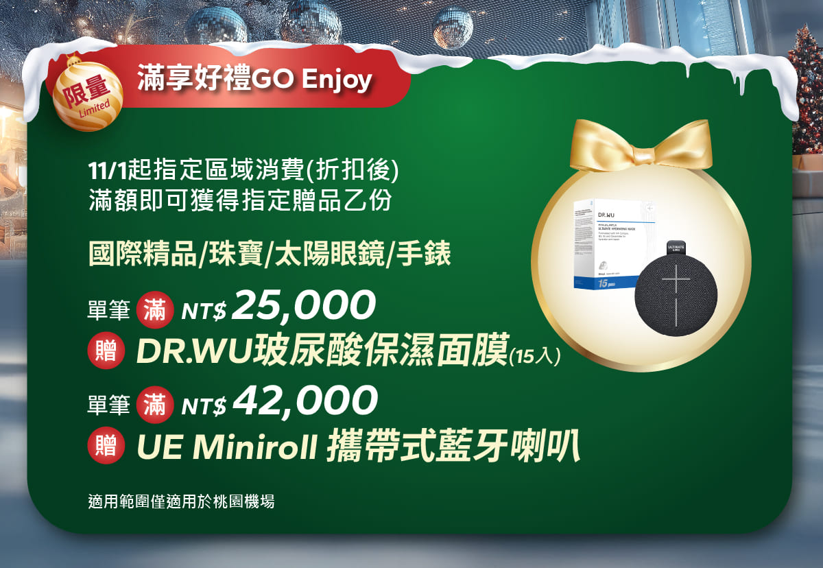 - 單筆NT$滿25,000 贈 DR.WU玻尿酸保濕面膜15入