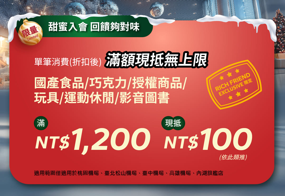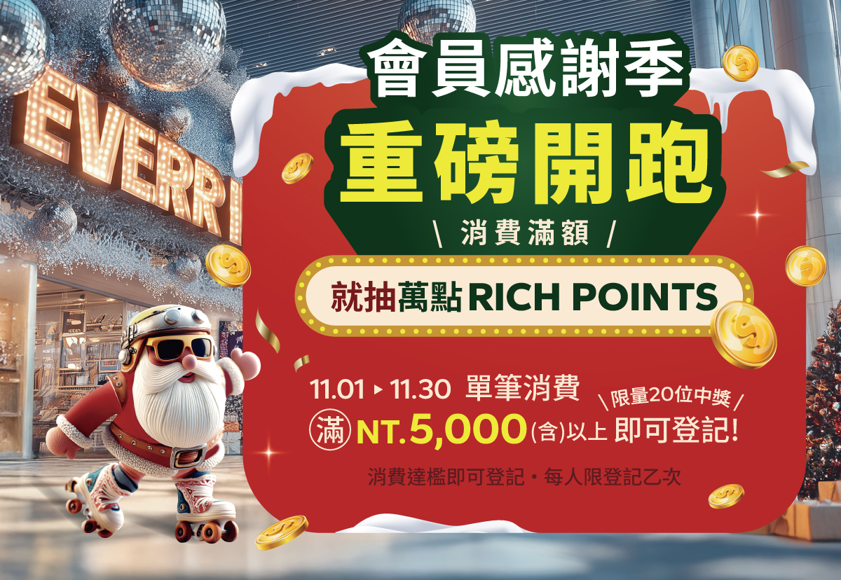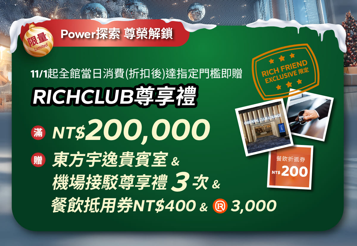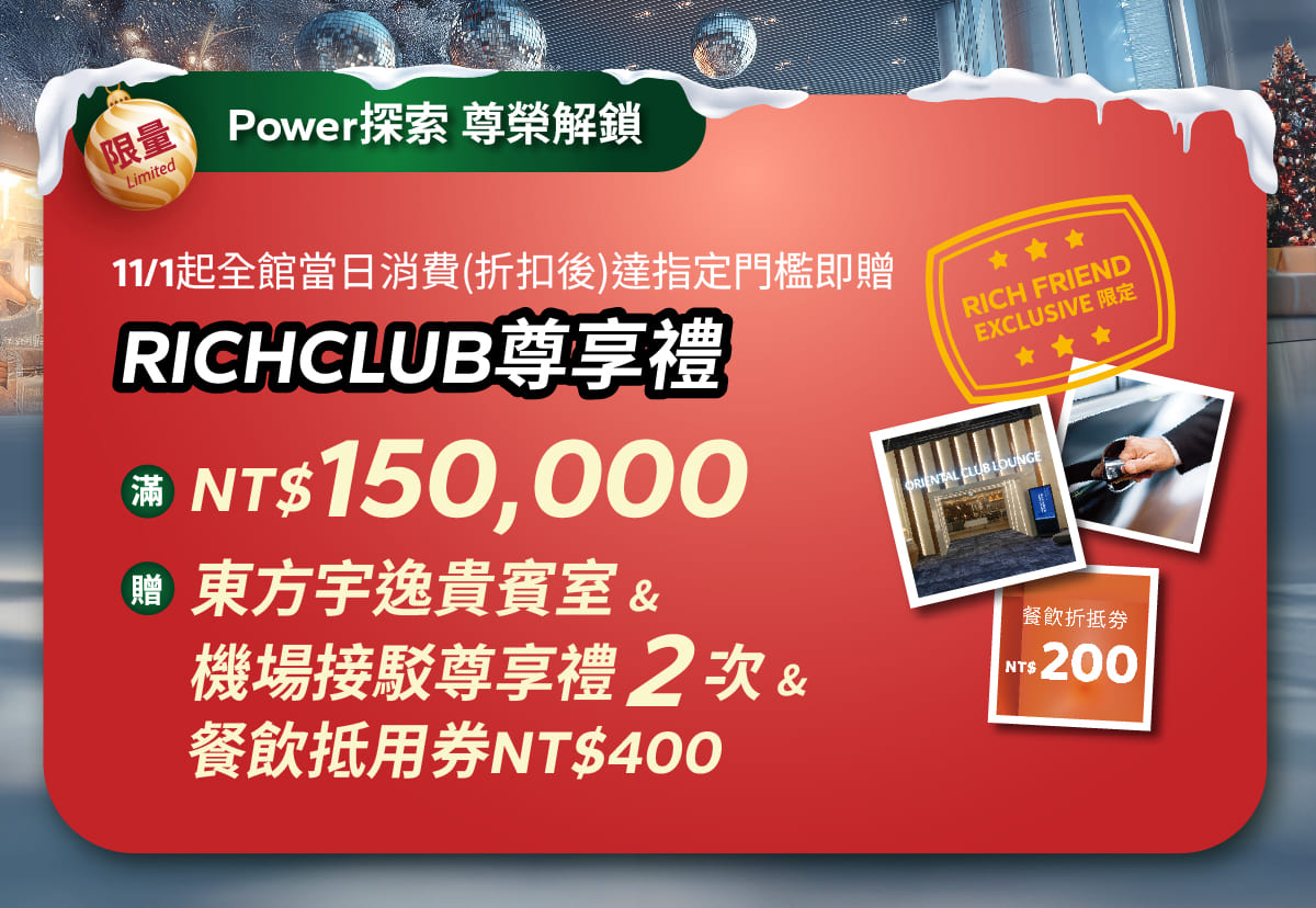 11/01起 全館當日消費(折扣後)達指定門檻即贈RICHCLUB尊享禮