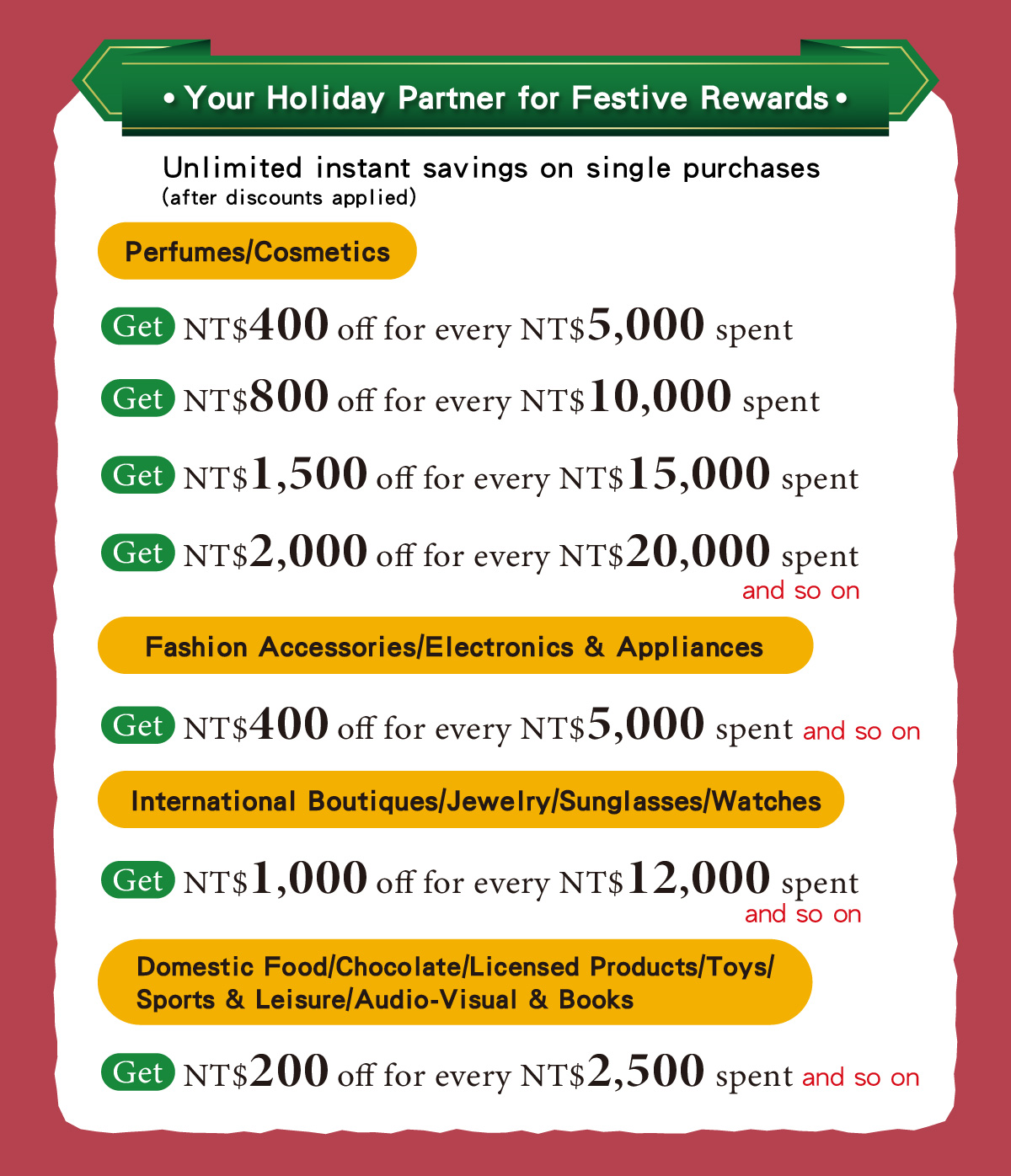 Get NT$400 off for every NT$5,000 spent(and so on)
