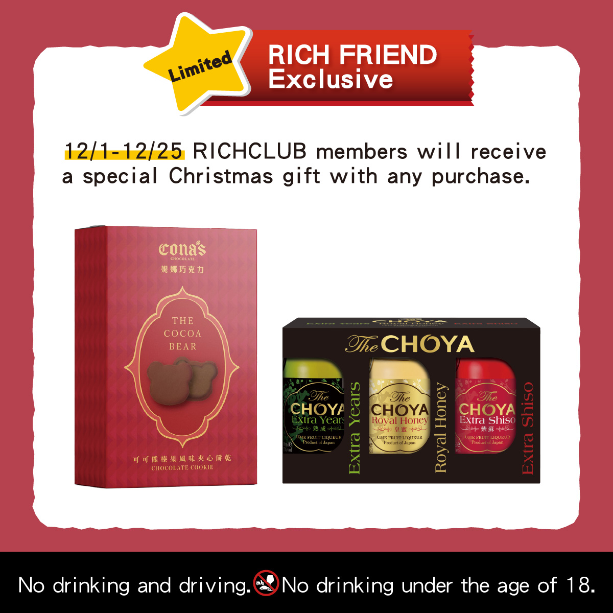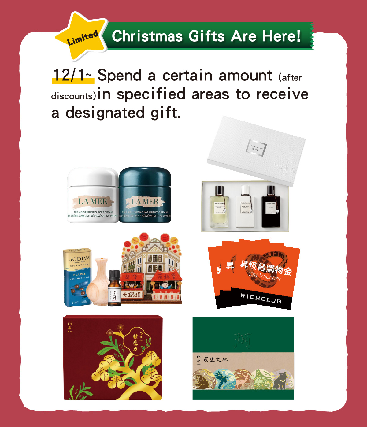 12/1-12/25 RICHCLUB Navigator&Creator Members Present your Christmas Gift Voucher and make any purchase in the International Boutiques, Jewelry, Sunglasses, Watches, or Fashion Accessories area to receive a Christmas gift.