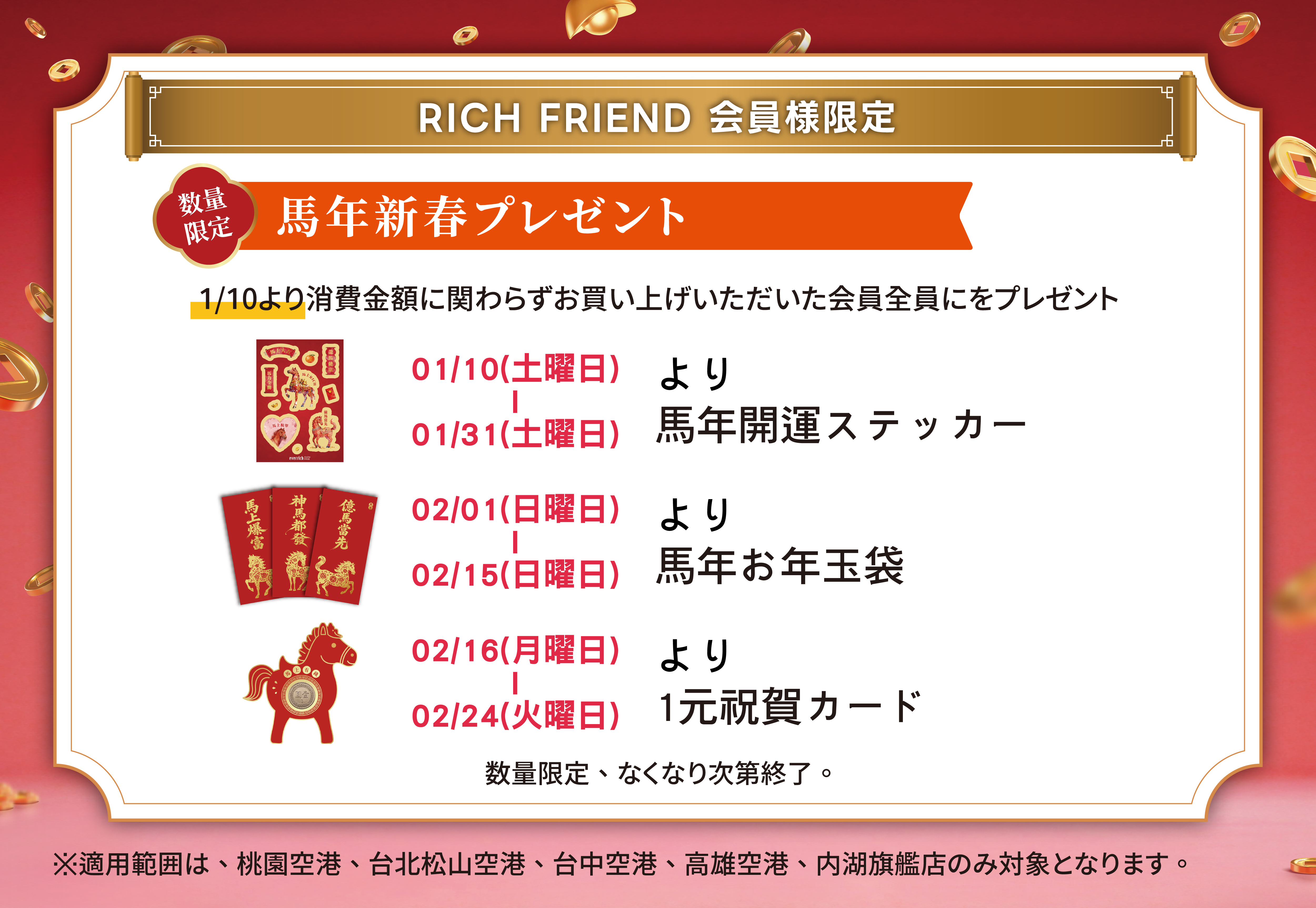 2.メンバー限定で、1回のご購入金額がNT$1,000以上(割引後)の場合、リッチな新春抽選に1回参加できます。