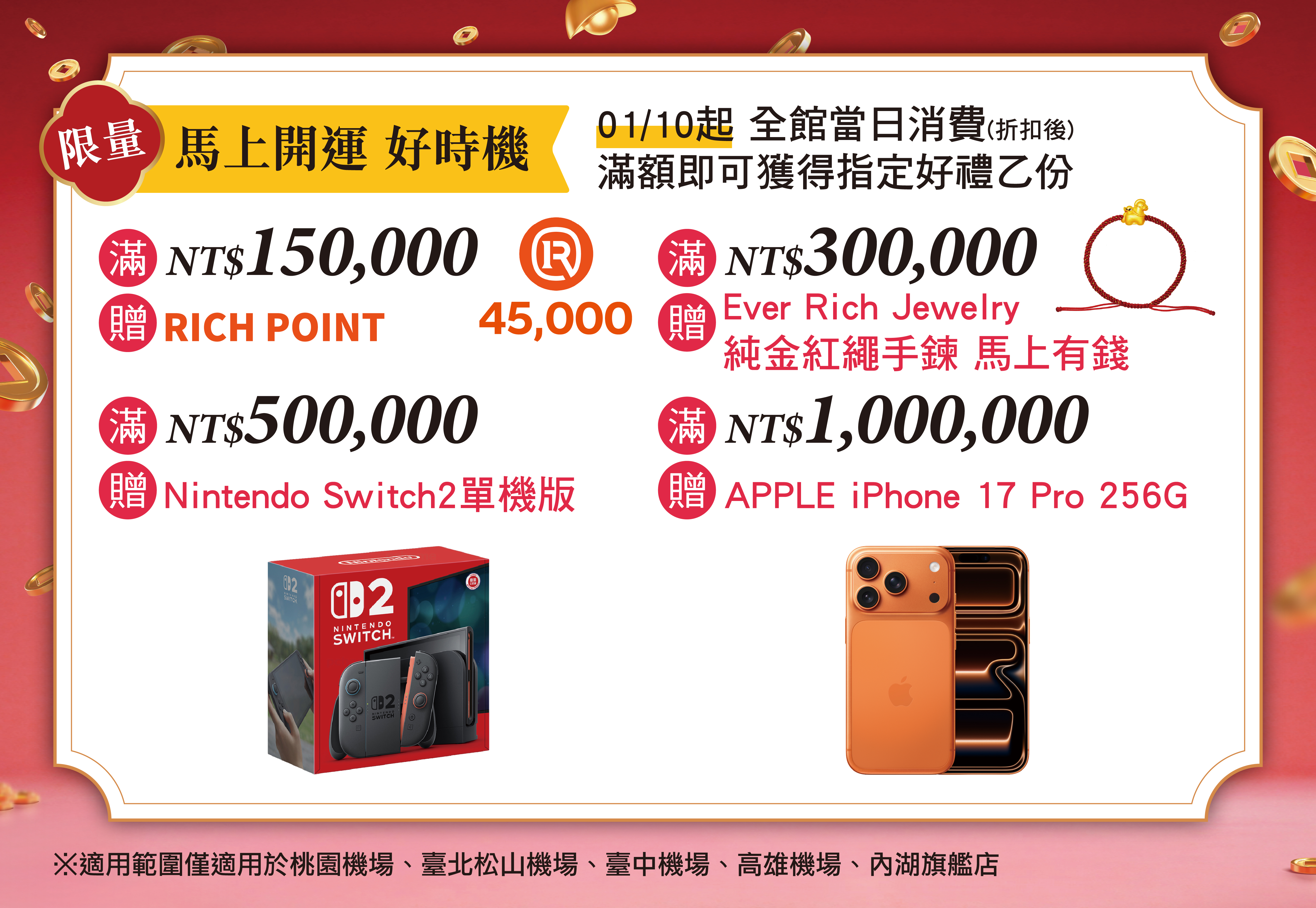 1.本活動僅限 2025/01/10-2025/02/24 期間內於昇恆昌全區店別之營業據點單筆消費滿 NT$12,000之RICHCLUB會員參與。