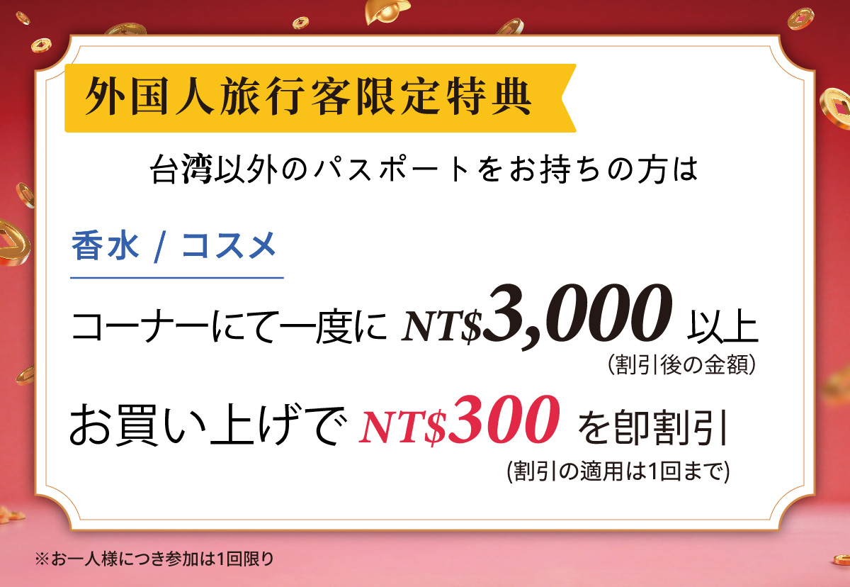 コーナーにて一度にNT$3,000以上(割引後の金額)ご購入の場合、