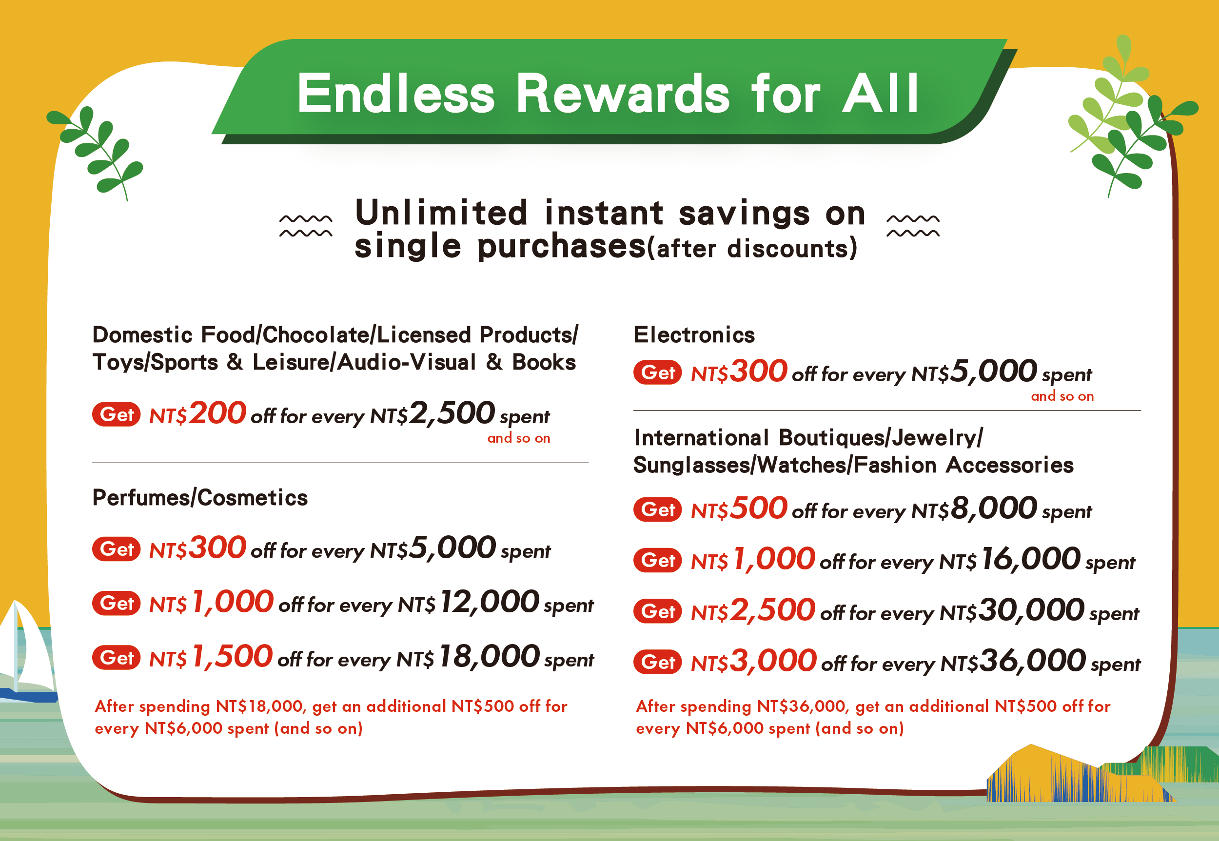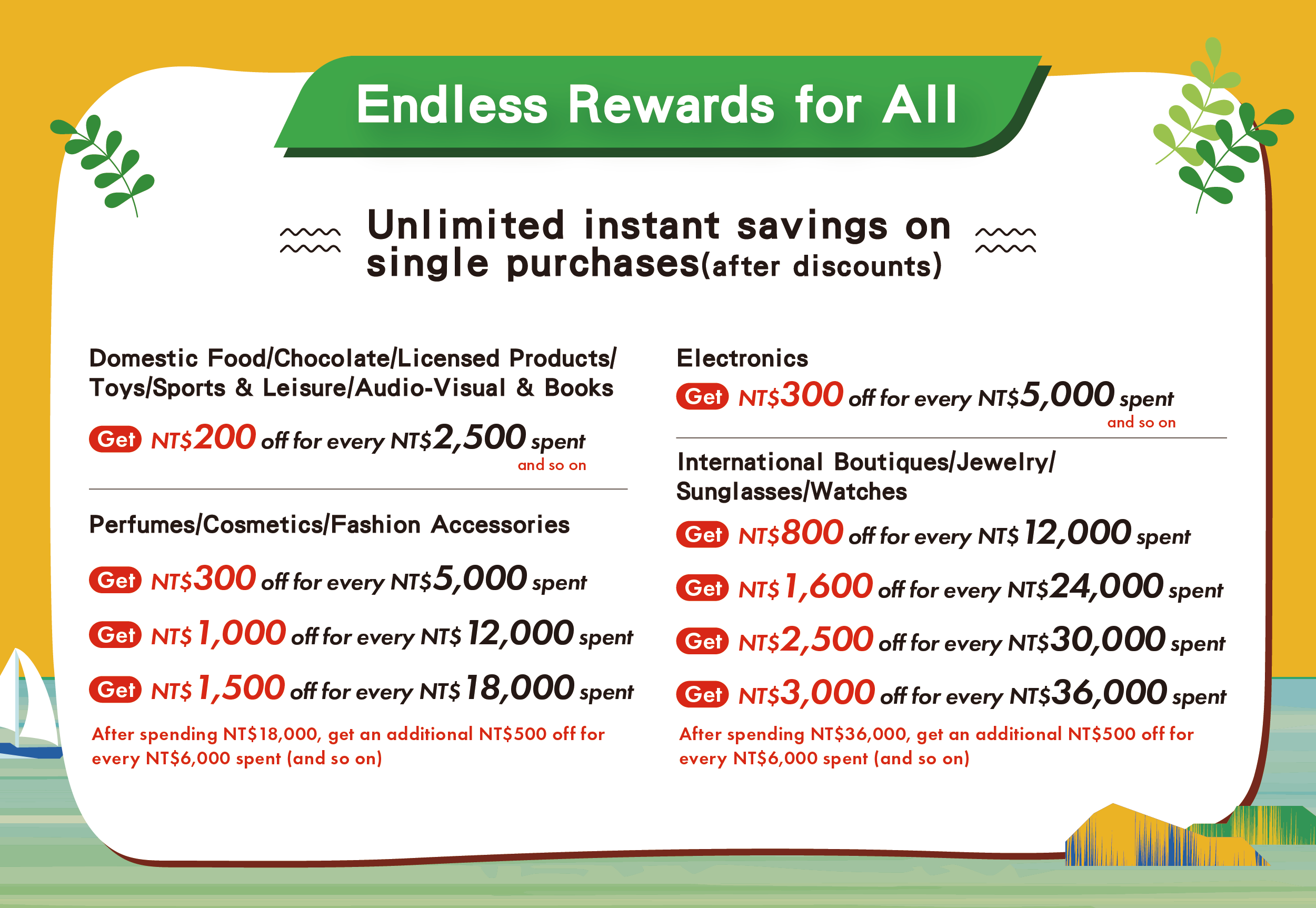 After spending NT$36,000, get an additional NT$500 off for every NT$6,000 spent (and so on)