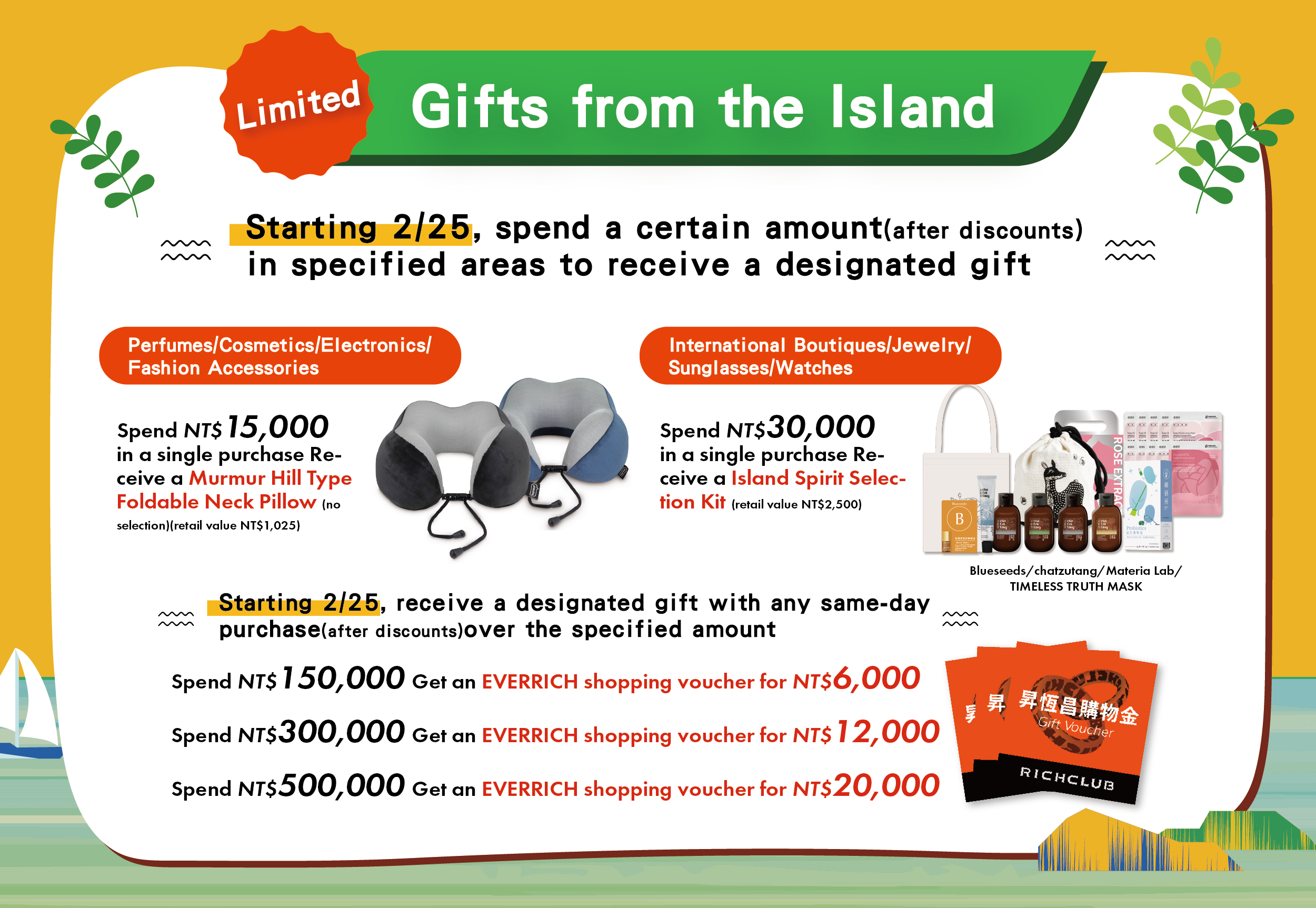 Starting 2/25, receive a designated gift with any same-day purchase (after discounts) over the specified amount Spend NT$150,000 Get an EVERRICH shopping voucher for NT$6,000 Spend NT$300,000 Get an EVERRICH shopping voucher for NT$12,000 Spend NT$500,000 Get an EVERRICH shopping voucher for NT$20,000 |