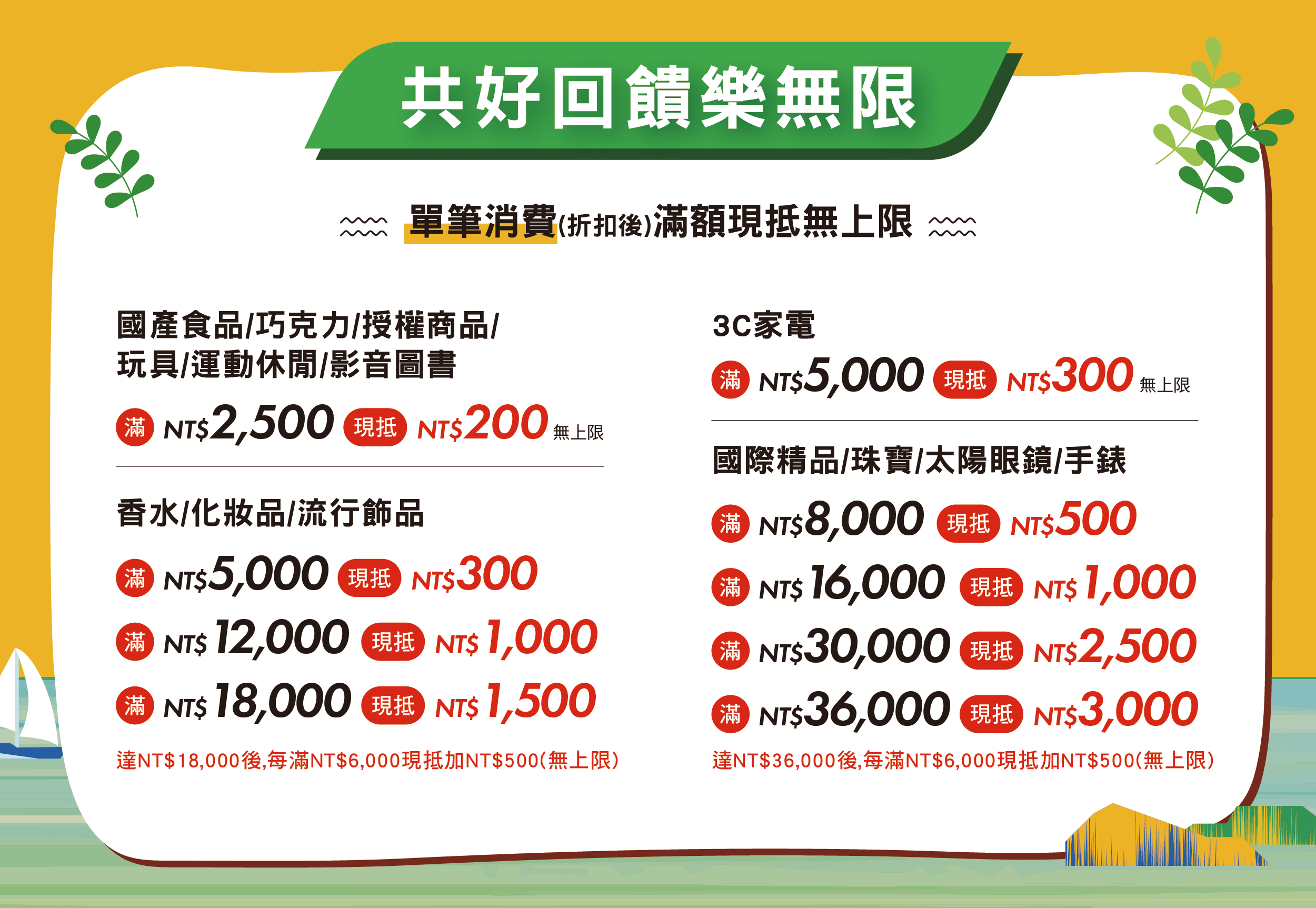 達NT$36,000後,每滿NT$6,000現抵加NT$500(依此類推)