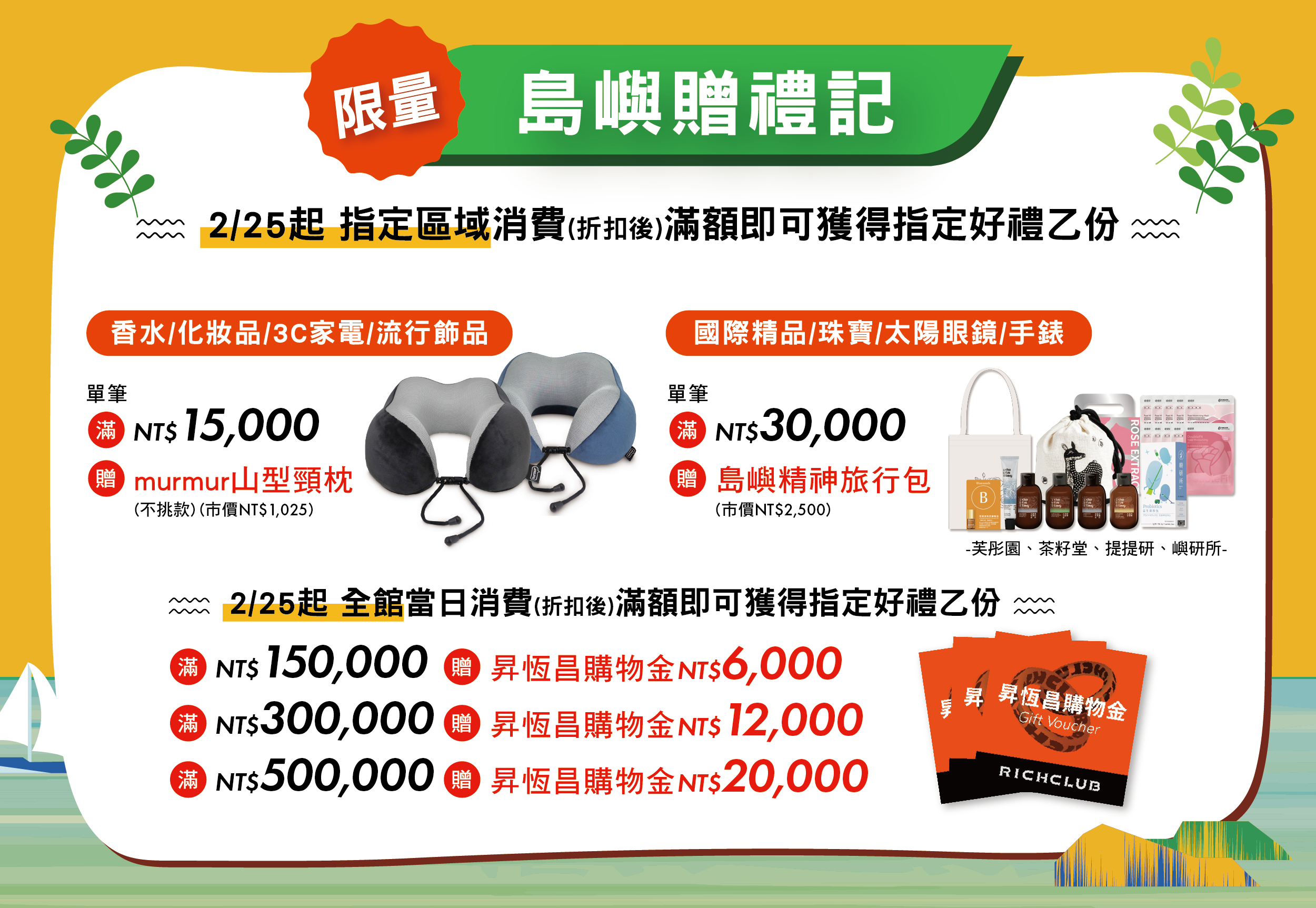 - 單筆滿額贈:菸、酒、雪茄、黃金、藥類、指定品牌(Gucci、Hermes、Breguet、Chopard)、特價珠寶手錶、外招櫃,恕不參與活動。