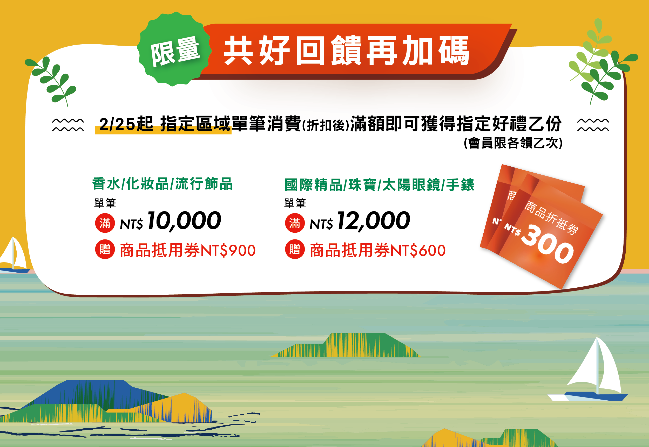 2/25起指定區域消費(折扣後)滿額 或 全館當日消費(折扣後)