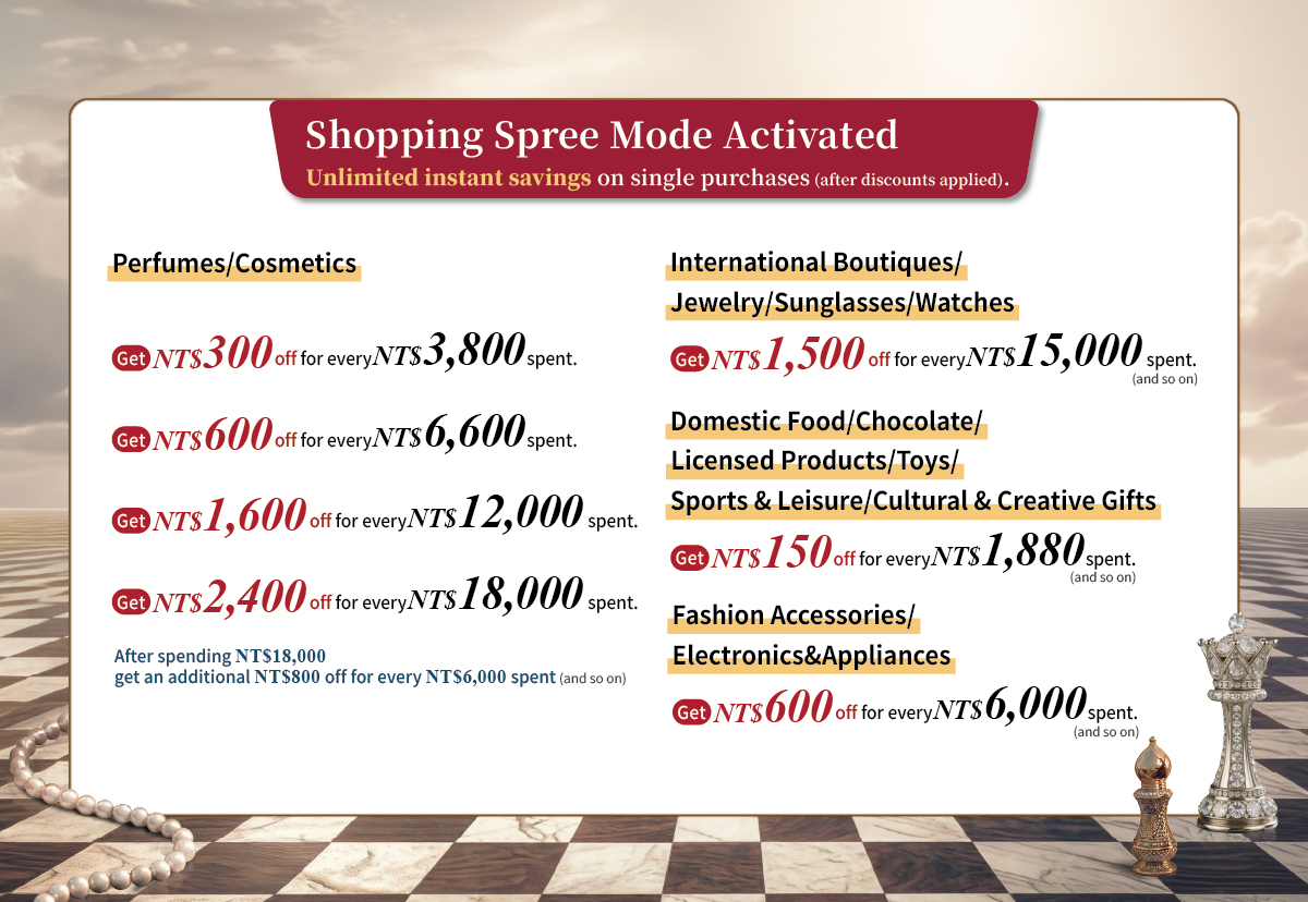 After spending NT$18,000, get an additional NT$800 off for every NT$6,000 spent (and so on)