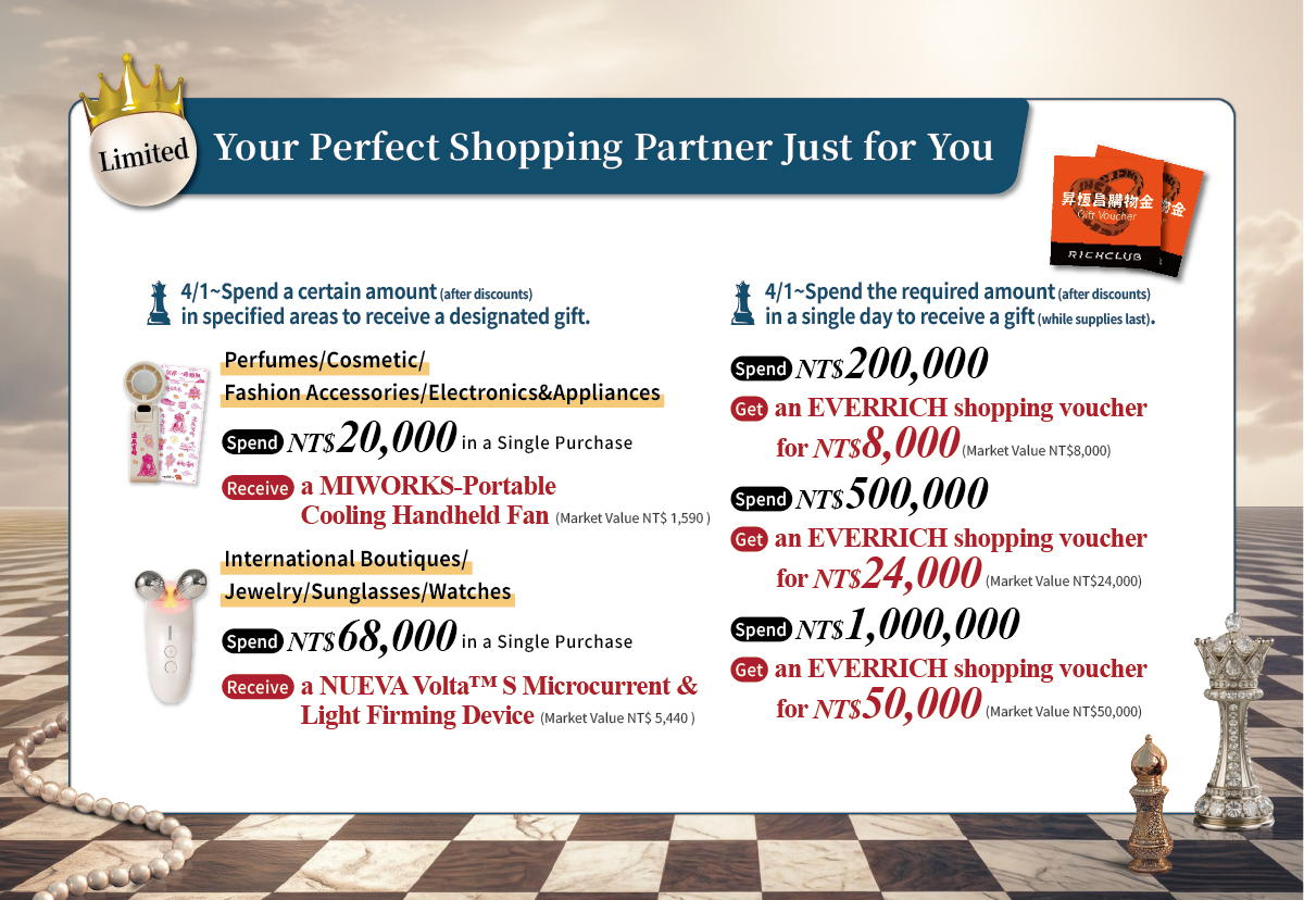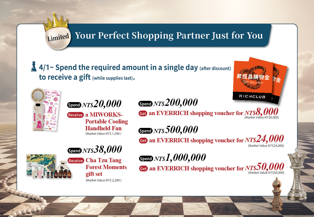 Spend NT$1,000,000 Get an EVERRICH shopping voucher for NT$50,000 (Market Value NT$50,000)