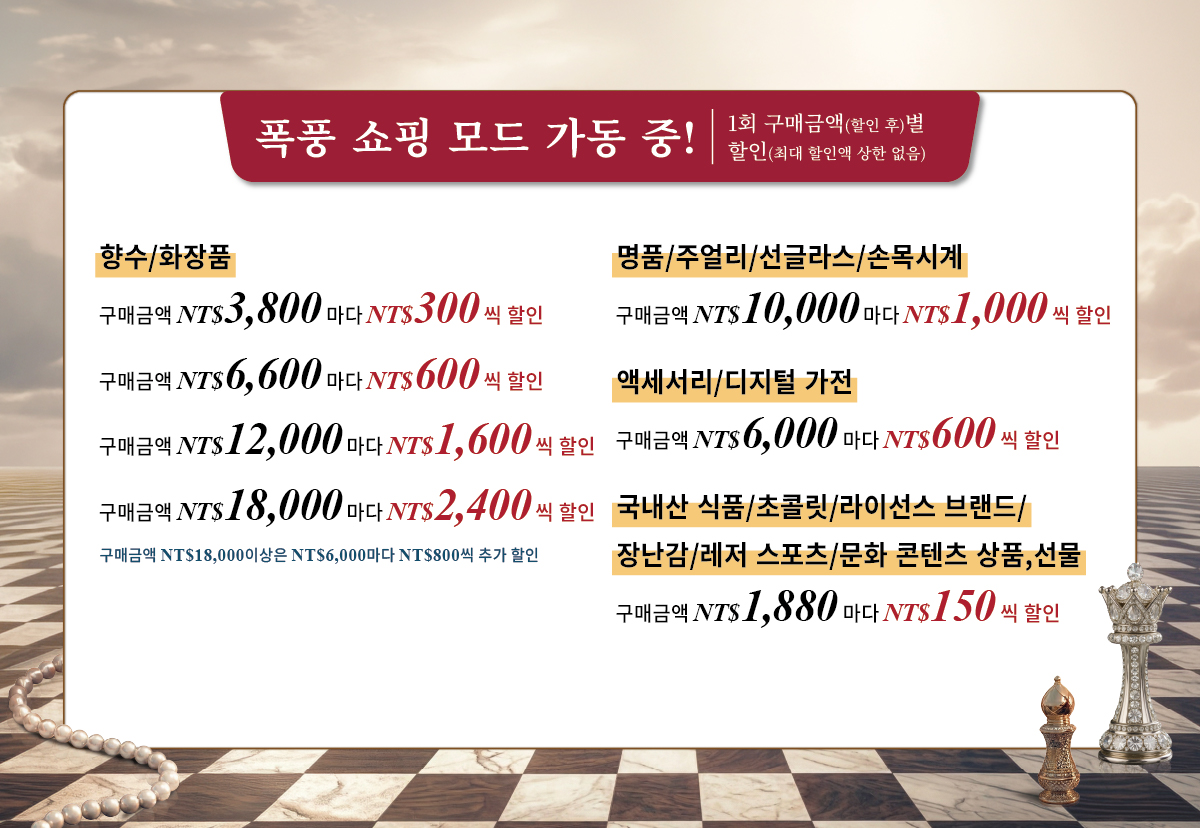 구매금액 NT$18,000이상은 NT$6,000마다 NT$800씩 추가 할인