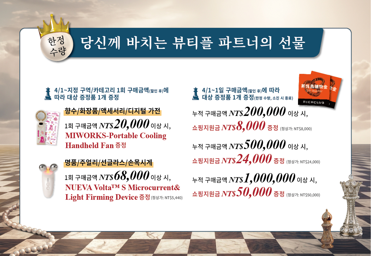 누적 구매금액NT$1,000,000이상 시, 쇼핑지원금 NT$50,000 증정(정상가:NT$50,000)