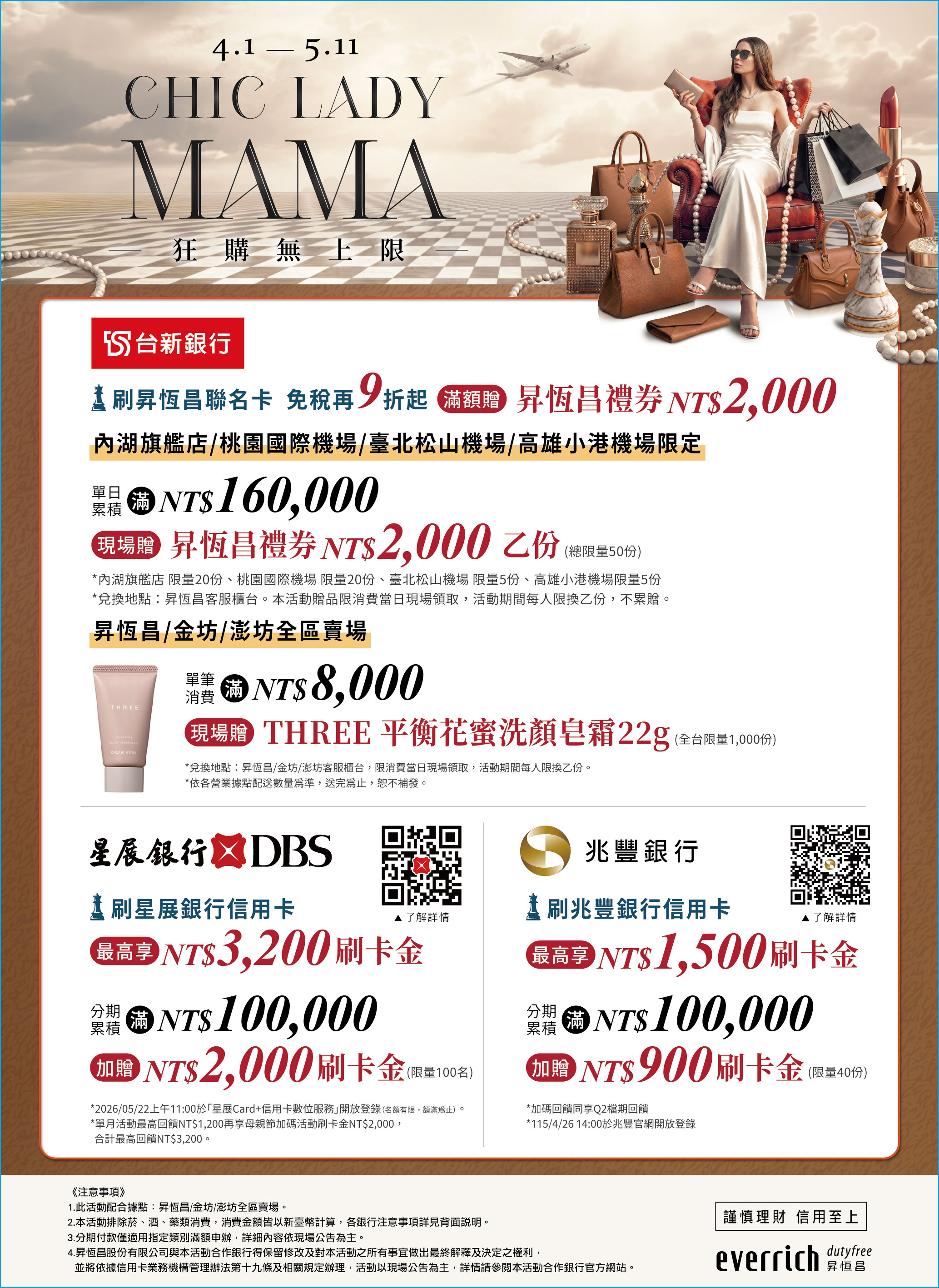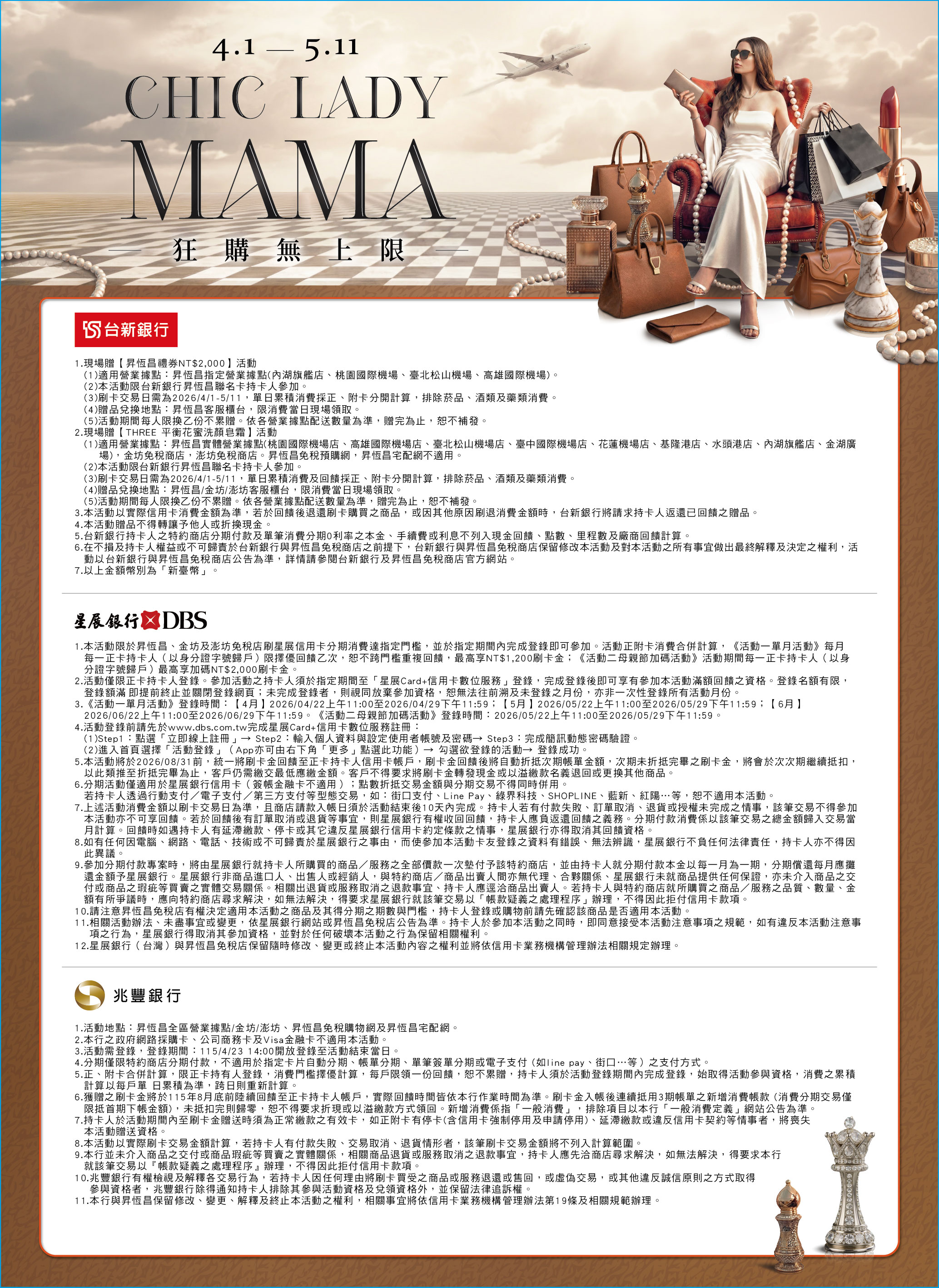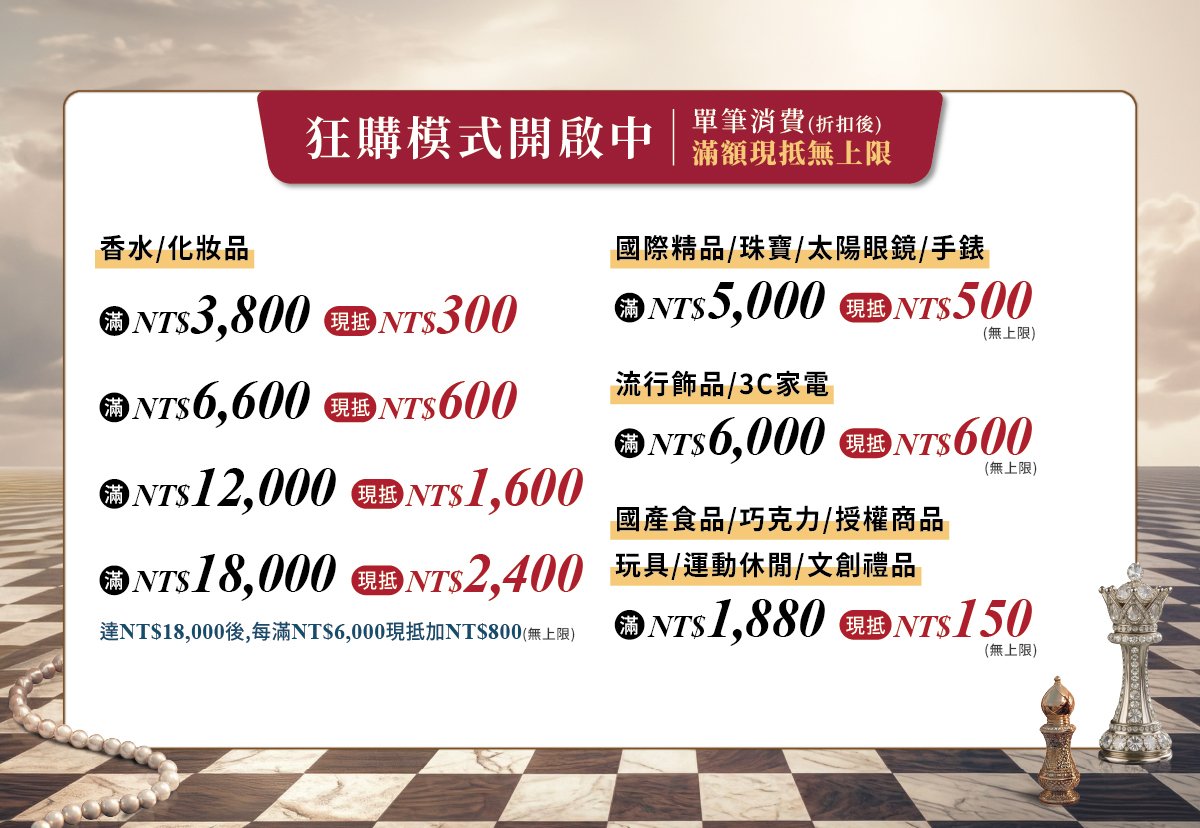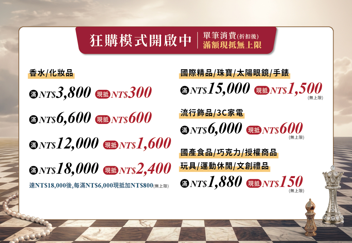 滿 NT$18,000 後,每滿 NT$6,000 再抵 NT$800(無上限)