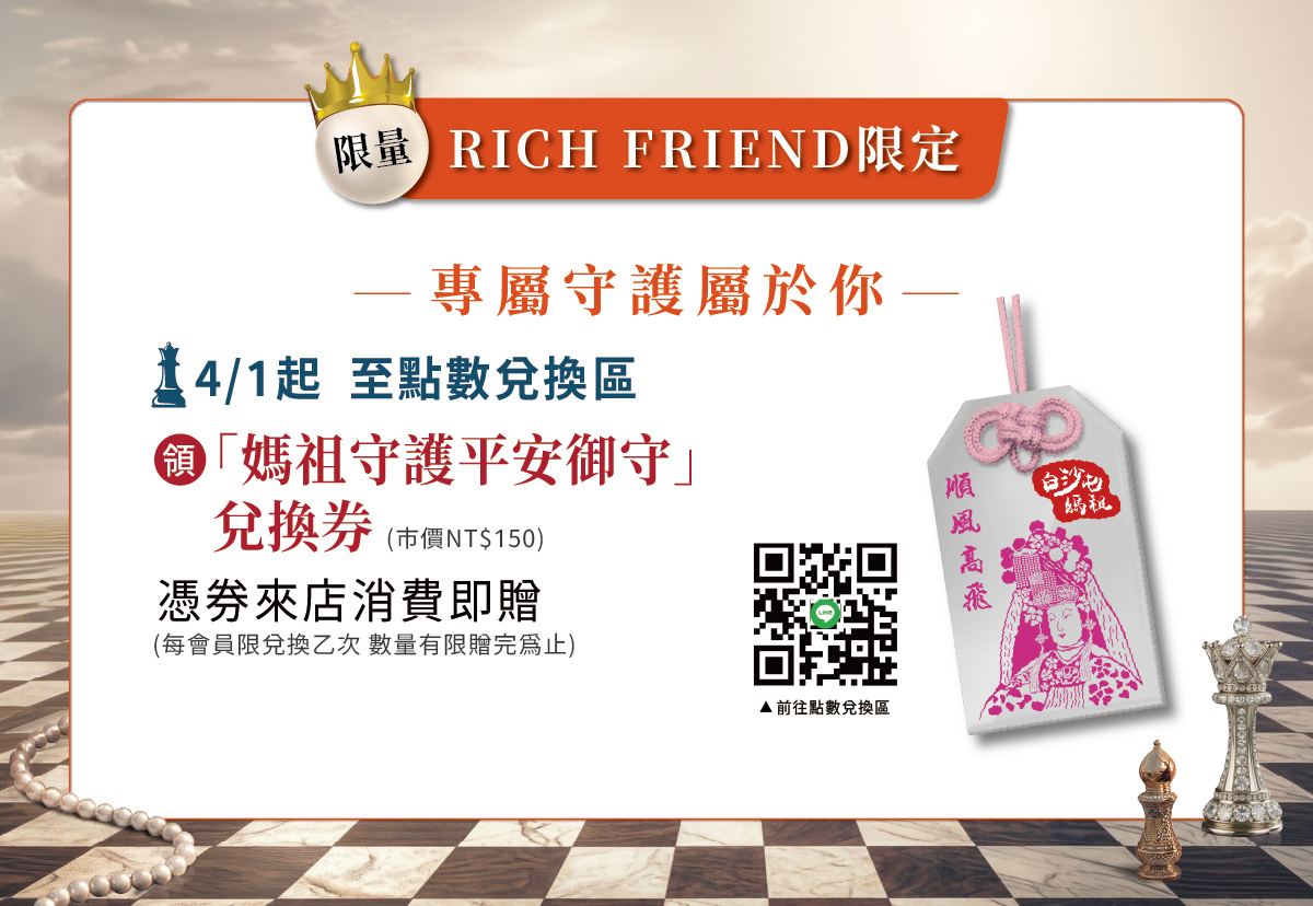 可領取「媽祖守護平安御守」兌換券(市價 NT$150)