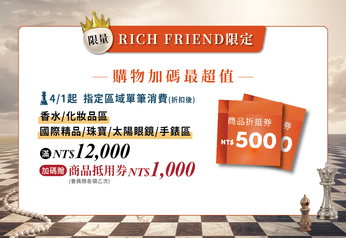 滿 NT$12,000加碼贈 商品抵用券 NT$1,000(會員限各區乙次)