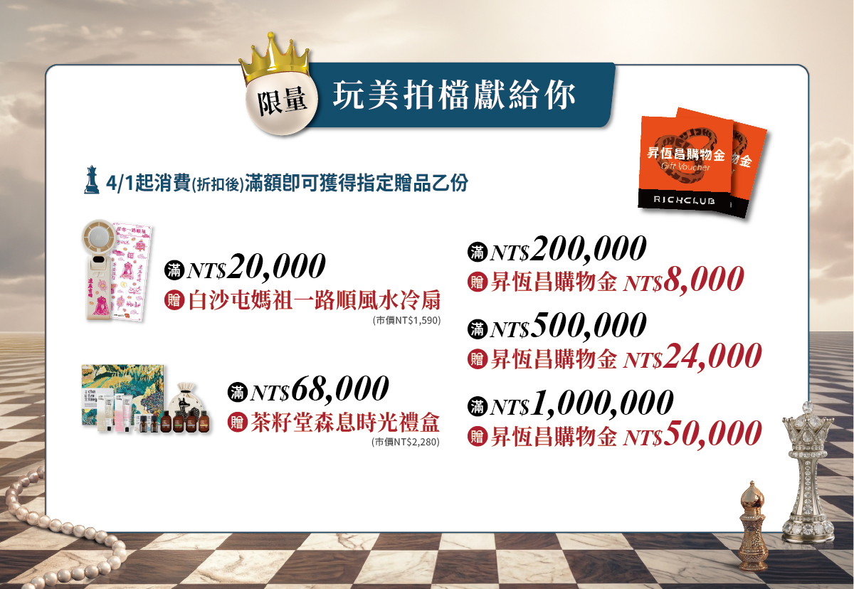 4/1 起消費(折扣後)滿額,即可獲得指定贈品乙份